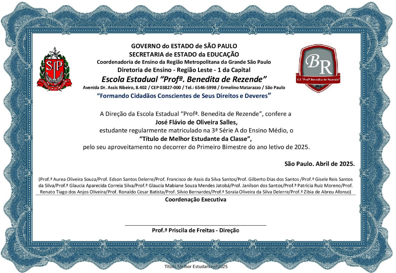 5.1.3. Ao estudante que alcançar a maior nota na avaliação final, receberá, além do “Título de Melhor Estudante da Escola Estadual Professora Benedita de Rezende, em 2025”, um Prêmio Surpresa a critério da direção da unidade escolar.